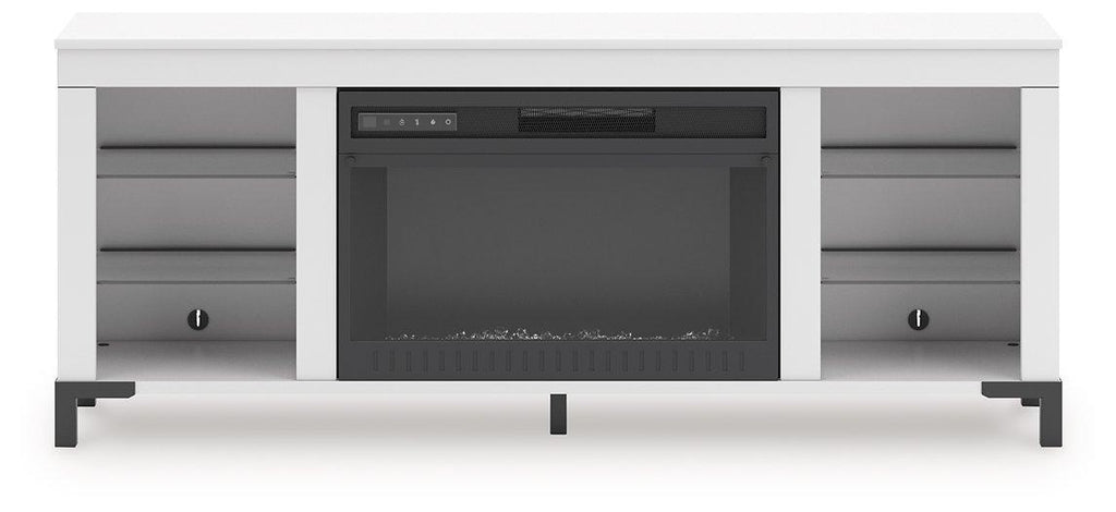 - Fireplace insert and shelves feature color and brightness controlled LED lighting