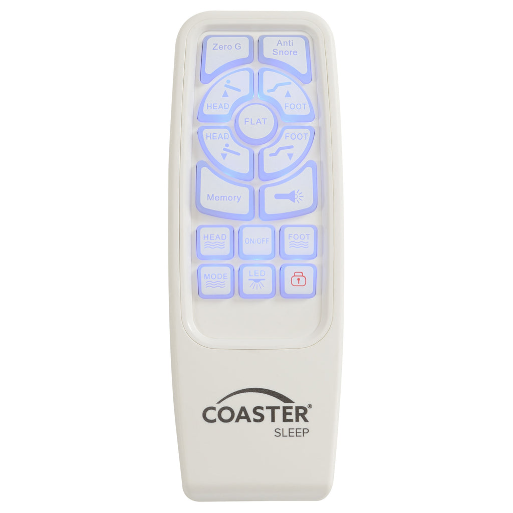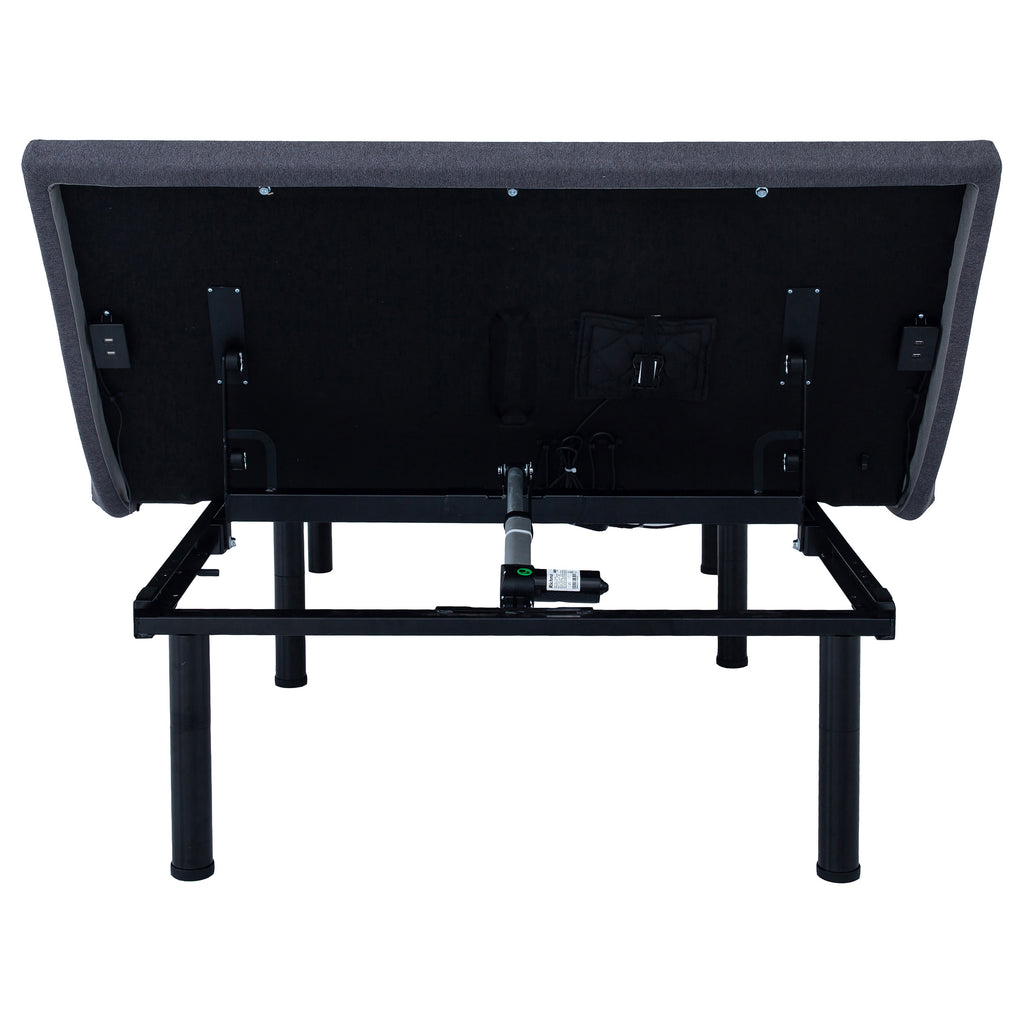 Revitalize yourself each and every night with this stunning multifunctional adjustable bed base with grey fabric trim and adjustable or removable legs. The bed base delivers the latest in modern technology with dual massage function on the head and foot of the bed, with three levels of intensity for optimal relaxation. The bed is equipped with a wireless remote that's backlit and gives full control of the height of the head and foot of the bed and includes presets for a most comfortable night's sleep. Each side of the bed is equipped with a dual USB port perfect for keeping bedside electronics charged and ready to use. You can even control the bed from your phone with Bluetooth connectivity and the Coaster app installed on your smart device. This premium adjustable bed base revolutionizes your bedroom into a relaxing multi-functional space and provides an abundance of features and customizable ergonomic positions to get great sleep and revitalize yourself.