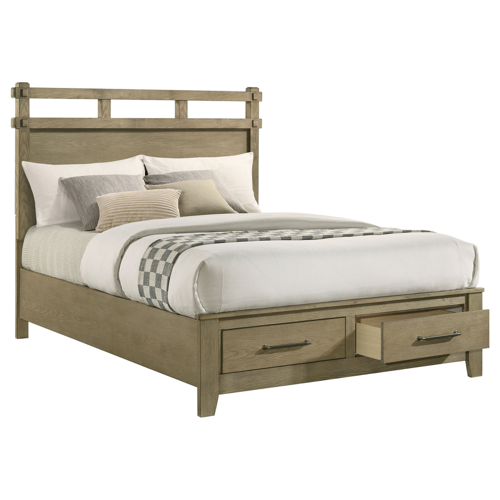 This platform storage bed blends graceful simplicity with practical function. A vineyard oak finish highlights the embossed oak grain across rubberwood and engineered wood veneer. The headboard features framed platforming with open slat detail for added visual lightness. Two footboard drawers provide concealed storage, supported by durable center metal glides. A warm transitional style, this bed balances everyday utility with natural wood textures and quiet charm. Key Features: • Queen platform storage bed finished in vineyard oak with oak grain embossed veneer • Framed headboard with open slat accents adds visual depth and balance • Two footboard drawers provide concealed storage for linens or accessories • Drawers feature center metal glides for smooth and durable use • Crafted from rubberwood and engineered wood veneer for strength • Medium density fiberboard (Mdf) platform panels provide unbeatable support with no foundation needed