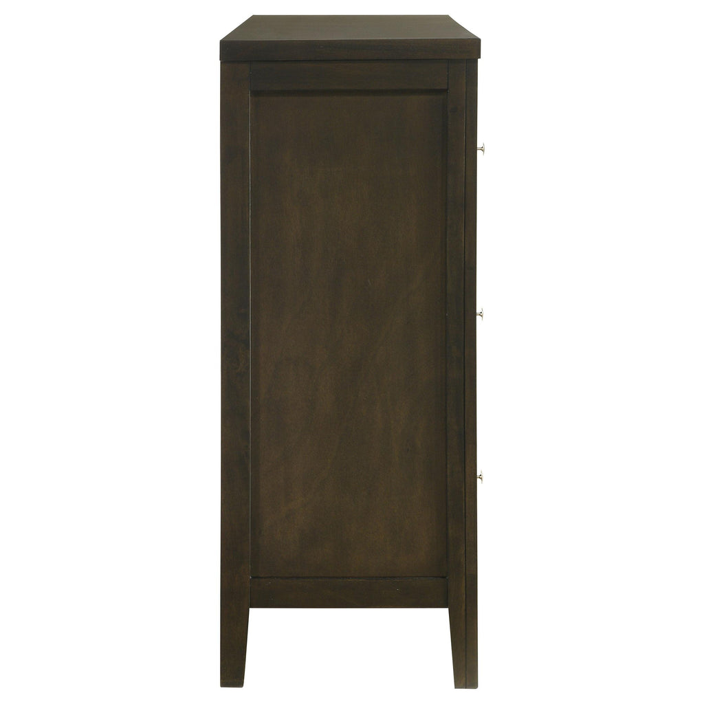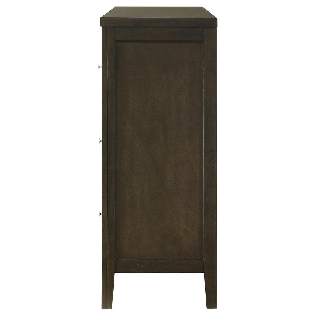 This six-drawer dresser offers generous storage and sophisticated style, making it an essential addition to any modern bedroom. The dark cocoa finish highlights the clean lines and vertical details, adding depth and character to the piece. The drawers are fitted with brushed nickel hardware, giving the dresser a sleek, contemporary look. Each drawer operates smoothly on center metal glides, providing easy access to your wardrobe. Constructed from solid rubberwood and tropical wood veneers, this dresser blends function with timeless style. Key Features: • Six-drawer dresser with generous storage capacity • Dark cocoa finish adds warmth and sophistication • Brushed nickel hardware adds a modern touch • Center metal glides ensure smooth drawer operation • Crafted from rubberwood, engineered wood, and okume veneer for durability and style