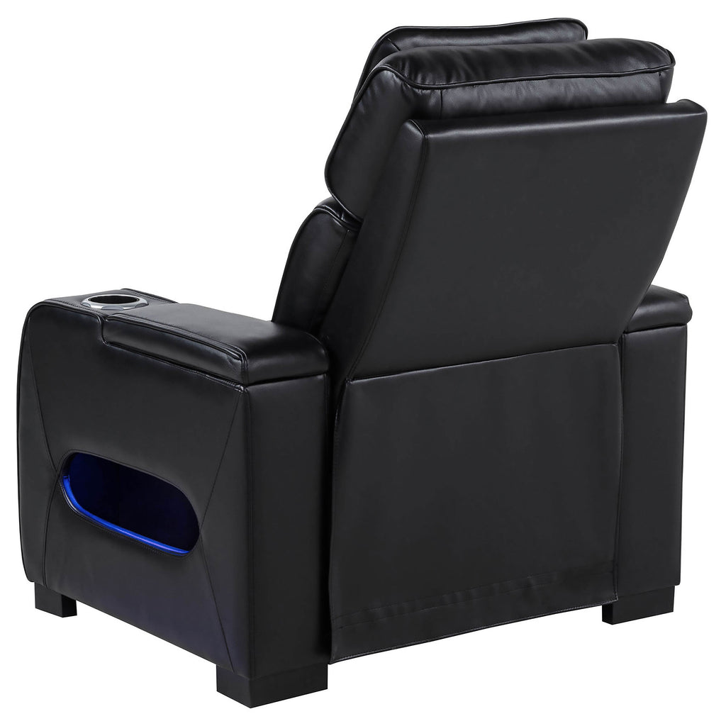 Perfectly sized for solo lounging, this dual power recliner blends tech-forward features with bold modern style. Enjoy power recline and an adjustable power headrest, plus side control panels with USB-A, USB-C, and a home button for seamless comfort. Blue LED under glow lights the base, while sleek cup holders are built into both arms. Upholstered in black leatherette with deep channel detailing, it’s a standout seat for any media room or lounge. Key Features: • Dual power recliner in black faux leather with power recline and power headrest function • Side panel includes USB-A, USB-C, and home button for personalized ergonomic control • Blue LED under glow lighting beneath base enhances lounge ambiance with bold flair • Sleek armrests include built-in cup holders for movie night or everyday relaxation • Upholstered in smooth leatherette with channeled back and seat for visual depth • Compact footprint suits home theaters, dens, or modern small-space living areas