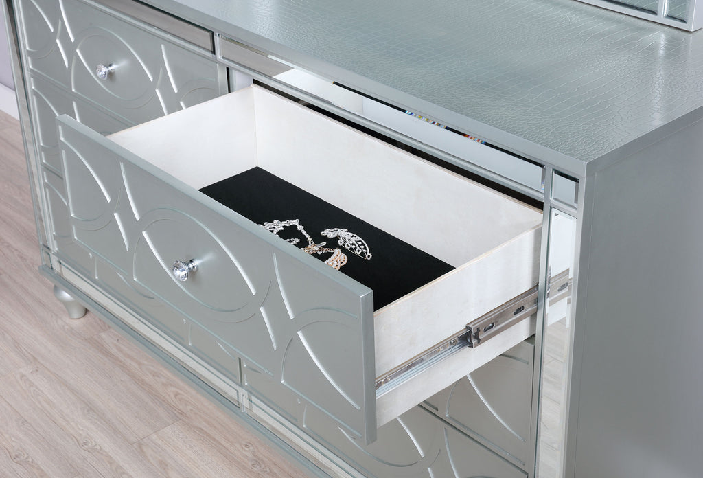 Give your home a modern glam update to classic design with this transitional six-drawer dresser. It features a glitzy design that takes center stage in any modern bedroom. It's fashioned with a vibrant silver metallic finish with fret work detail on the front panels and drawer fronts. The drawers are adorned with crystal-like pulls and the top ones are lined with black felt. Delicate bun feet complete the design of this exquisite showpiece dresser. Key Features: • Six-drawer dresser with silver metallic frame and mirrored trim • Fretwork panel overlays and crystal drawer pulls enhance glam styling • Top drawers are felt-lined to store watches, jewelry, or eyewear • Smooth-gliding drawers with clear sealer interior finish for convenience • Turned bun feet elevate the profile with traditional design elements • Engineered wood build with mirrored and polyresin detailing